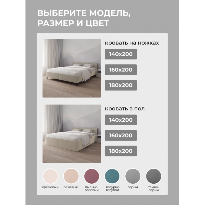 Обратите внимание: матрас в комплект поставки не входит и приобретается отдельно. Это позволяет вам самостоятельно выбрать матрас с учетом индивидуальных предпочтений по жесткости и высоте. В нашем каталоге представлен широкий ассортимент матрасов различных типов — ознакомиться с ними можно в разделе матрасы.