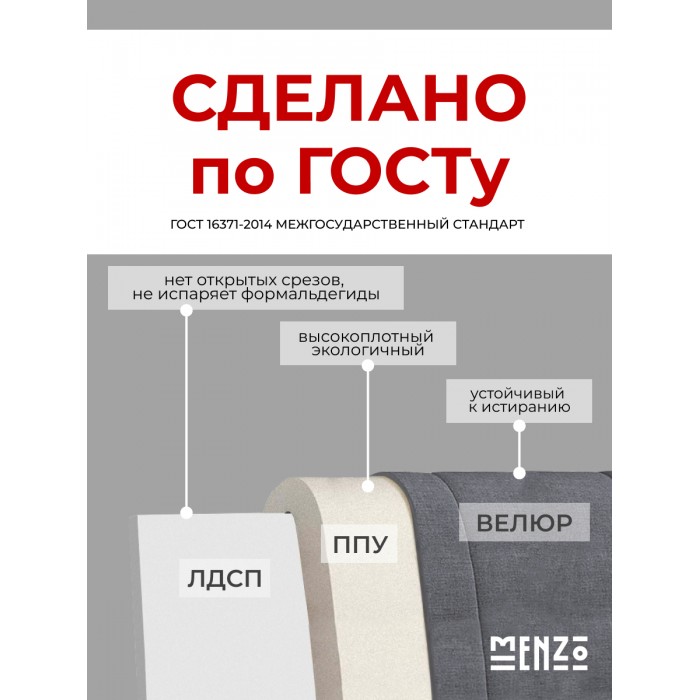 Корпус из ЛДСП гарантирует долговечность конструкции, а велюровая обивка добавляет спальне уюта. Материал приятен к коже и выглядит дорого, при этом не требует сложного ухода.